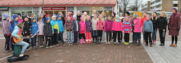Laulavia päiväkotilapsia ja -tätejä.
